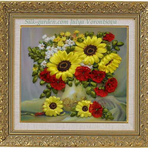 Набор для вышивания атласными лентами Подсолнухи и маки в кувшине, Шелковый сад