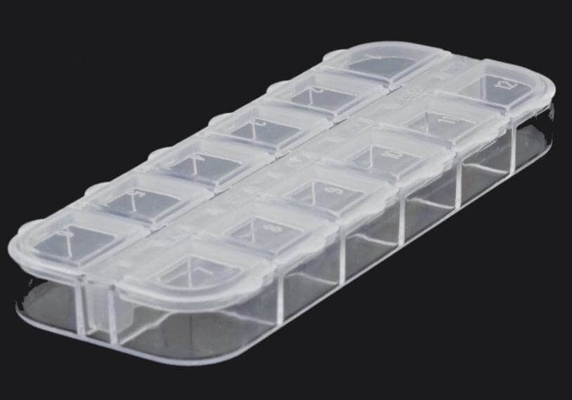 Органайзер для хранения бисера и различных мелочей на 12 ячеек. Каждая ячейка пронумерована. Размер ячеек - 1.5х1.5х1см (8шт) и 1.8х1.5х1см (4шт).