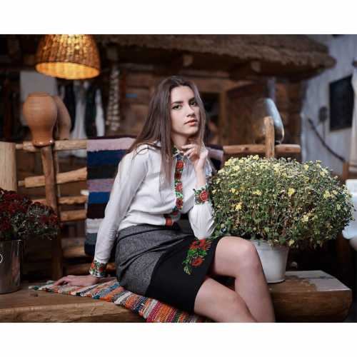 Женская блуза с машинной вышивкой (арт. B-9921409). Состав ткани: 60% хлопок, 40% лён. Доступные размеры: 38-54. Производство - Луцк, Украина.