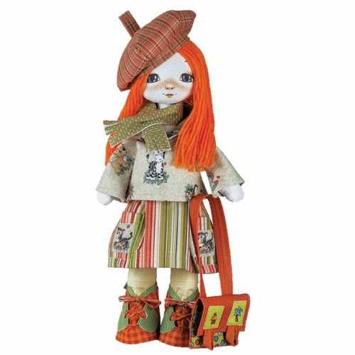 Набор для шитья игрушек Путешественница компании Новая Слобода состоит из льна с нанесенной выкройкой, нетканки с нанесенной выкройкой, пряжи для прически, наполнителя, пуговиц, выкройки, фото мастер-класса.
