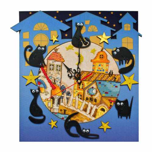 Набор для вышивки смешанной техникой Кошкин дом компании Новая Слобода состоит из канвы Aida 14 с нанесенным рисунком, ниток мулине Palmira 180, бисера Slovenska Busa, декоративных элементов, рамки, часового механизма, иглы для вышивания, нитевдевателя, цветной схемы и подробной инструкции.