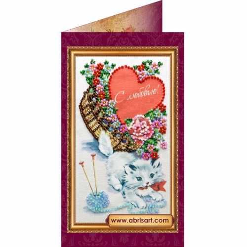 Набор для вышивки открытки бисером С любовью-2 (арт. AO-019) Абрис Арт содержит картонную открытку со вставкой художественного сукна, на которое нанесены рисунок и схема, бисер (Preciosa или Matsuno), бисерную иглу и инструкцию.