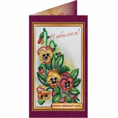 Набор для вышивки открытки бисером С Юбилеем-2 (арт. AO-097) Абрис Арт содержит картонную открытку со вставкой художественного сукна, на которое нанесены рисунок и схема, бисер (Preciosa или Matsuno), бисерную иглу и инструкцию.