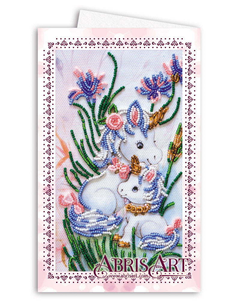 Набор для вышивки открытки-конверта микробисером Единорожки (арт. AOM-006) Абрис Арт содержит картонную открытку со вставкой художественного сукна, на которое нанесены рисунок и схема, бисер №13 (Preciosa), бисерную иглу и инструкцию.