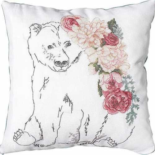 Набор для вышивки подушки счетным крестом Белый медведь (арт. PB119) ТМ Luca-S содержит цветное фото готовой подушки, немецкую ткань для вышивания Zweigart, мулине Anchor, счетную схему, иглу, русскую инструкцию, а также молнию.