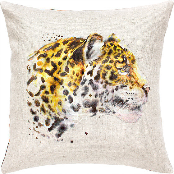 Набор для вышивки подушки счетным крестом Леопард (арт.PB183) ТМ Luca-S содержит цветное фото готовой подушки, немецкую ткань для вышивания Fein-Floba (53) 25 ct, мулине Anchor, счетную схему, иглу, русскую инструкцию.