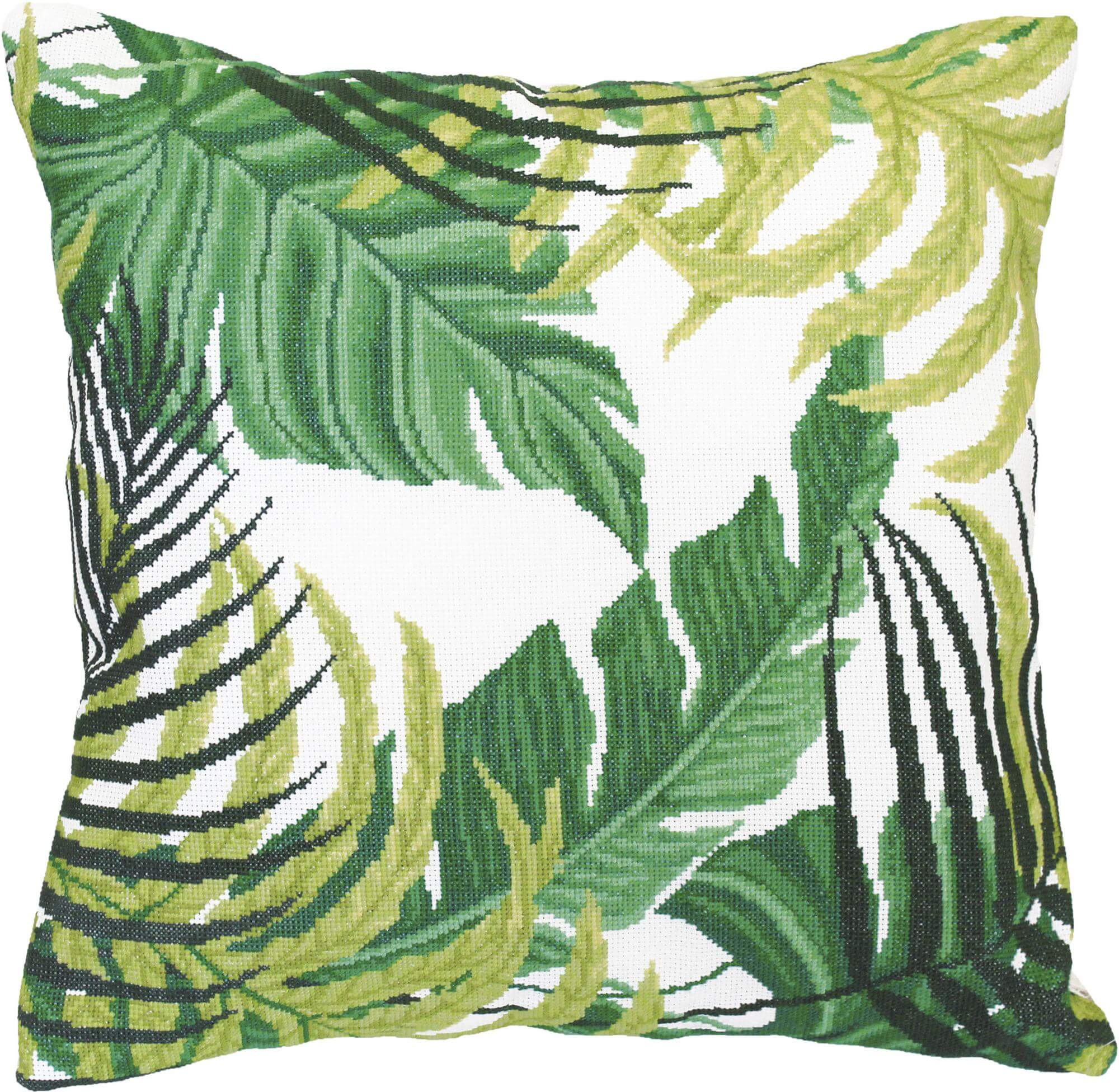 Набор для вышивания подушки Тропические листья содержит подробную инструкцию вместе с цветной символьной схемой, канву Aida 14, хлопковые нитки мулине Bestex - 10 цв. и иглу. Размер вышивки 40х40см.
