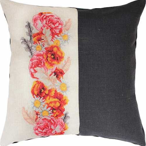 Набор для вышивки подушки счетным крестом Цветы (арт. PB128) ТМ Luca-S содержит цветное фото готовой подушки, немецкую ткань для вышивания Zweigart, мулине Anchor, счетную схему, иглу, русскую инструкцию, а также молнию.