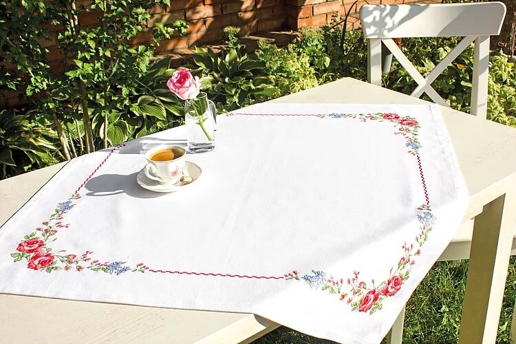 Набор для вышивки скатерти крестом FM006 компании Luca-S содержит изображение готовой работы, схему, мулине Anchor, канву Lugana 25 ct. (100), иглу и инструкцию на русском языке.
