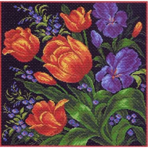 Набор для вышивания подушки Тюльпаны (1098N) ТМ Матренин посад содержит канву Aida 14 с нанесенным на нее цветным рисунком, мулине ПНК им.Кирова (15 цветов), иглу и инструкцию по вышивке.