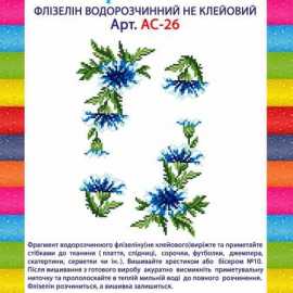 Водорастворимый флизелин Васильки АС-26 (не клеевой) для вышивки крестом или бисером (Preciosa №10). Для вышивания на любой одежде аккуратно вырежьте и приметайте фрагмент флизелина с нанесенной схемой. После окончания работы, уберите нить и прополоскайте готовое изделие в теплой, мыльной воде до полного растворения флизелина.