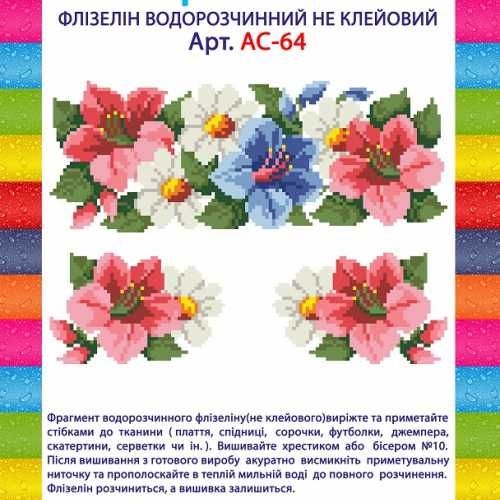 Водорастворимый флизелин Лилии АС-64 (не клеевой) для вышивки крестом или бисером (Preciosa №10). Для вышивания на любой одежде аккуратно вырежьте и приметайте фрагмент флизелина с нанесенной схемой. После окончания работы, уберите нить и прополоскайте готовое изделие в теплой, мыльной воде до полного растворения флизелина.