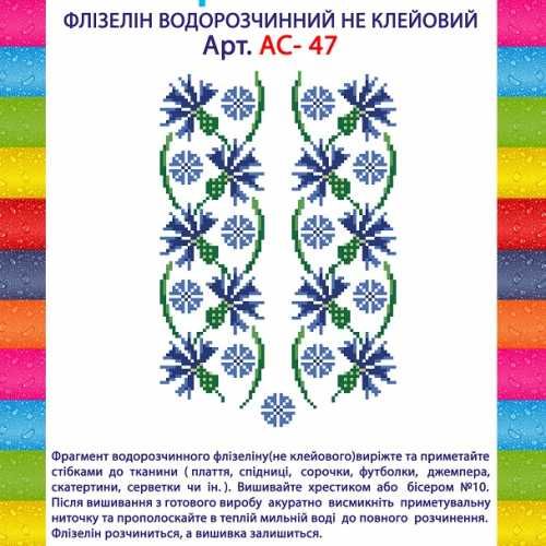Водорастворимый флизелин Орнамент с васильками АС-47 (не клеевой) для вышивки крестом или бисером (Preciosa №10). Для вышивания на любой одежде аккуратно вырежьте и приметайте фрагмент флизелина с нанесенной схемой. После окончания работы, уберите нить и прополоскайте готовое изделие в теплой, мыльной воде до полного растворения флизелина.