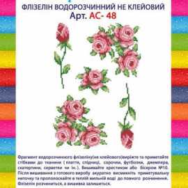 Водорастворимый флизелин Розы АС-48 (не клеевой) для вышивки крестом или бисером (Preciosa №10). Для вышивания на любой одежде аккуратно вырежьте и приметайте фрагмент флизелина с нанесенной схемой. После окончания работы, уберите нить и прополоскайте готовое изделие в теплой, мыльной воде до полного растворения флизелина.