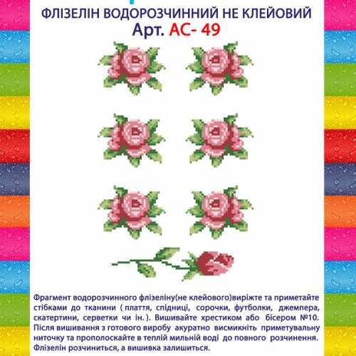 Водорастворимый флизелин Розы АС-49 (не клеевой) для вышивки крестом или бисером (Preciosa №10). Для вышивания на любой одежде аккуратно вырежьте и приметайте фрагмент флизелина с нанесенной схемой. После окончания работы, уберите нить и прополоскайте готовое изделие в теплой, мыльной воде до полного растворения флизелина.