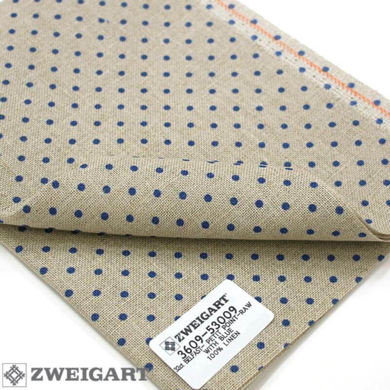 Ткань для вышивания Zweigart Belfast 32, арт. 3609-53009, цвет 53009 (сырой лен в синий горошек), ширина рулона 140см