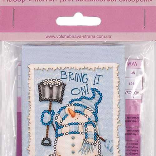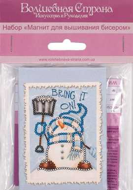 В набор для вышивания бисером на магните Снеговик-2 ТМ Волшебная страна входит схема, напечатанная на натуральном хлопчатобумажном полотне, которое натянуто на подрамник, бисер Preciosa, игла с нитью, инструкция и магнит.