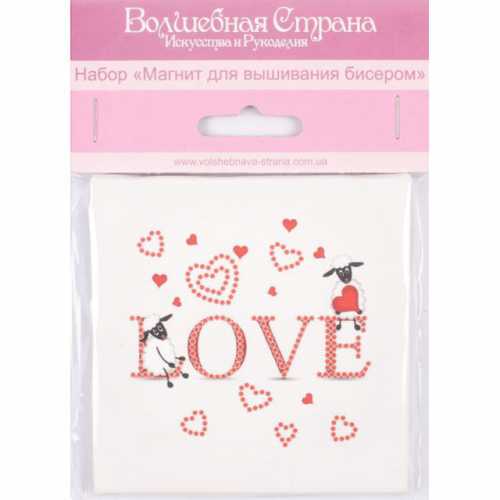 В набор для вышивания бисером на магните Love ТМ Волшебная страна входит схема, напечатанная на натуральном хлопчатобумажном полотне, которое натянуто на подрамник, бисер Preciosa, игла с нитью, инструкция и магнит.