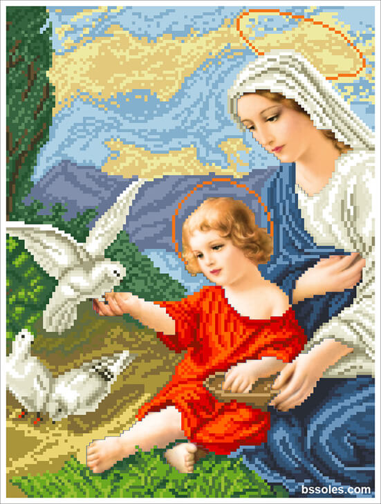 Набор для вышивания бисером Богородица и голуби, арт. БІГм-27, содержит схему с высокой детализацией, выполненную на плотном сатиновом шелке (пр-во Германия), и с краями, обработанными оверлоком, чешский бисер Preciosa и иглу.