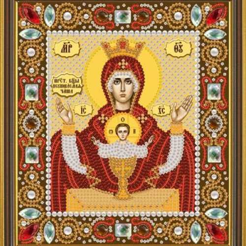 Набор для вышивки бисером Богородица Неупиваемая чаша компании Новая Слобода состоит из атласа с нанесенным изображением, бисера Slovenska Busa, пришивных камней, бусин, иглы для вышивки бисером, подробной инструкции.