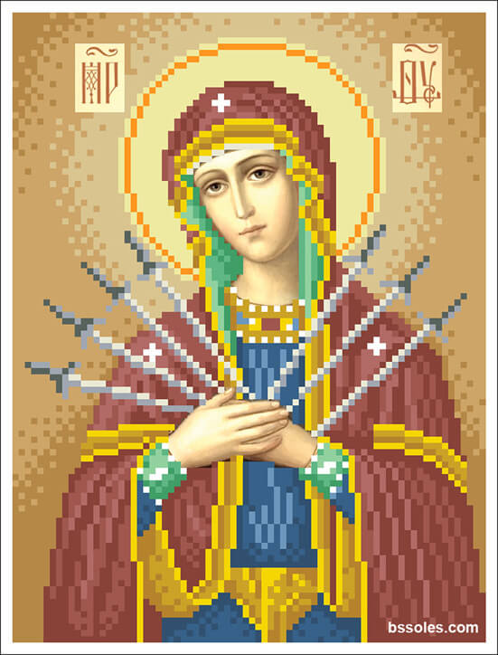 Набор для вышивания бисером Богородица Семистрельная, арт. БС-01-78, содержит схему с высокой детализацией, выполненную на плотном сатиновом шелке (пр-во Германия), и с краями, обработанными оверлоком, чешский бисер Preciosa и иглу.