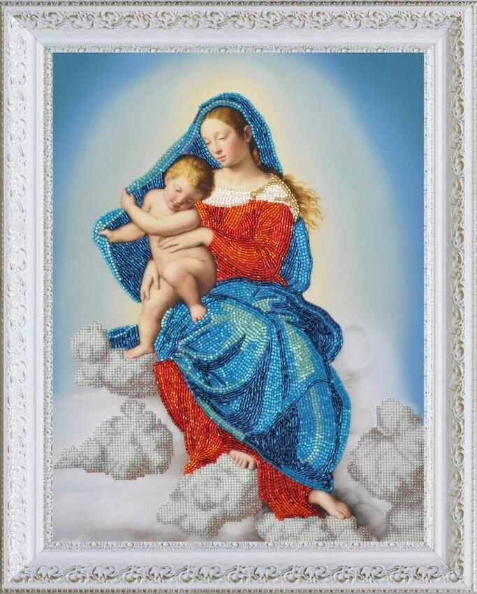 Набор для вышивки бисером Дева Мария с младенцем, Р-347 состоит из габардиновой схемы со стойкими цветами, которые не боятся стирки и не выцветают, чешского бисера Preciosa (или TOHO и бусин), иструкции и двух бисерных игл.