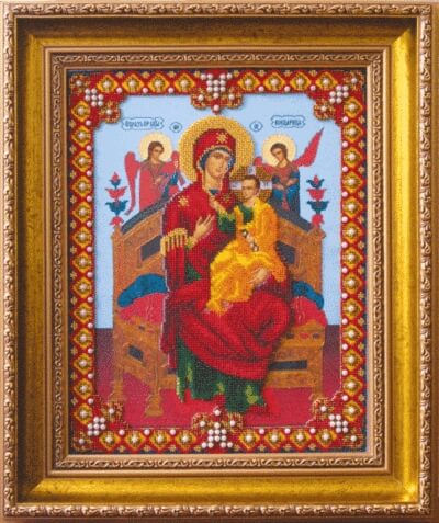 Набор для вышивания бисером Икона Божьей Матери Всецарица содержит подробную инструкцию, символьную схему, чешский бисер Preciosa - 14 цветов + 1 цвет бусины, ткань для вышивания с нанесенным рисунком, металлизированное мулине золотого цвета и иглы.