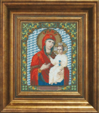 Набор для вышивания бисером Икона Божьей Матери Избавительница содержит подробную инструкцию, символьную схему, чешский бисер Preciosa - 24 цвета, металлизированная нить золотого цвета, ткань для вышивания с нанесенным рисунком и иглы.