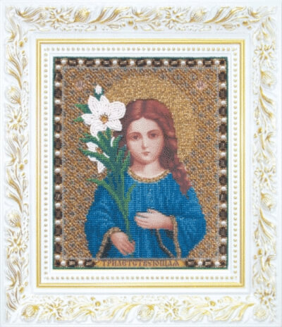 Набор для вышивания бисером Икона Божьей Матери Трилетствующая содержит подробную инструкцию, символьную схему, чешский бисер Preciosa - 14 цветов, ткань для вышивания с нанесенным рисунком и иглу.