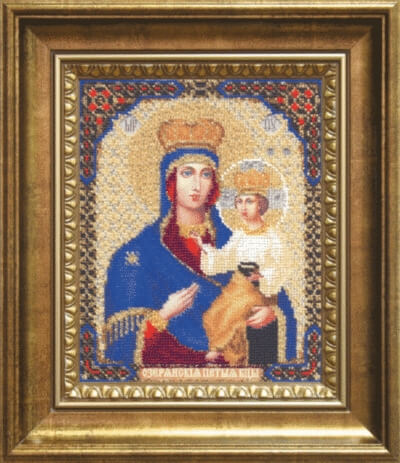 Набор для вышивания бисером Икона Пресвятой Богородицы Озерянская содержит подробную инструкцию, символьную схему, чешский бисер Preciosa - 19 цветов, ткань для вышивания с нанесенным рисунком и иглу.