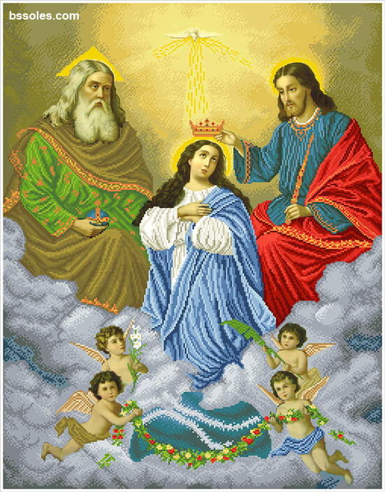 Набор для вышивания бисером Коронование Пресвятой Богородицы, арт. КПБ-59, содержит схему с высокой детализацией, выполненную на плотном сатиновом шелке (пр-во Германия), и с краями, обработанными оверлоком, чешский бисер Preciosa и иглу.