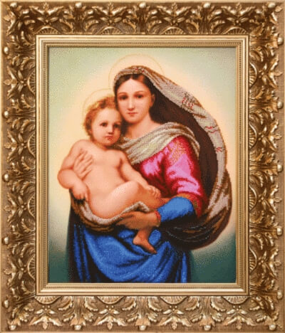Набор для вышивания бисером По мотивам Рафаэля Санти. Сикстинская Мадонна содержит подробную инструкцию, символьную схему, чешский бисер Preciosa - 23 цвета, металлизированное мулине золотого цвета, ткань для вышивания с нанесенным рисунком и иглы.