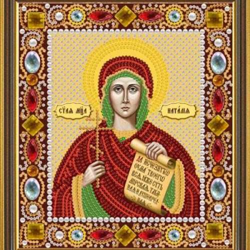 Набор для вышивки бисером Св. Мц. Наталия Никомидийская компании Новая Слобода состоит из атласа с нанесенным изображением, бисера Slovenska Busa, пришивных камней, бусин, иглы для вышивки бисером, подробной инструкции.