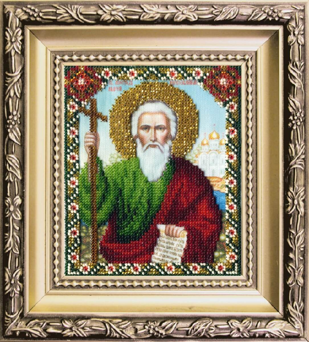 Набор для вышивания ювелирным бисером Икона святого апостола Андрея Первозванного содержит подробную инструкцию, символьную схему, ткань для вышивания с нанесенным рисунком, чешский бисер Preciosa - 14 цветов и бисерные иглы.