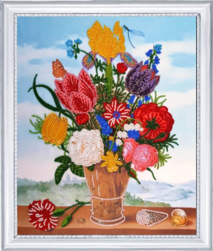 Набор для вышивки бисером с частичной зашивкой Букет на балконе (по мотивам А. Боссхерта), арт. bf178, ТМ Butterfly содержит атласную схему, бисер Preciosa (Чехия, 15 цветов), инструкцию и иглу для вышивания.