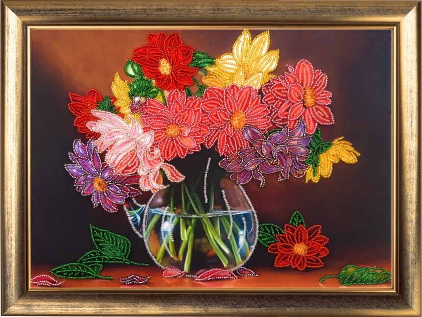 Набор для вышивки бисером с частичной зашивкой Букет георгинов, арт. bf159, ТМ Butterfly содержит атласную схему, бисер Preciosa (Чехия, 12 цветов), инструкцию и иглу для вышивания.