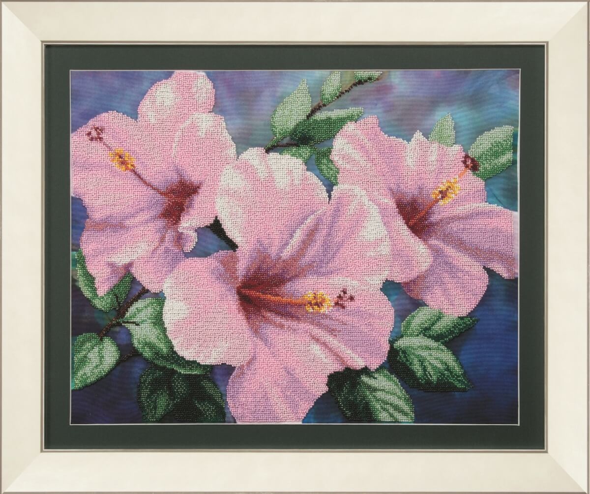Набор для вышивания бисером Гибискус розовый содержит подробную инструкцию, символьную схему, чешский бисер Preciosa - 25 цветов, ткань для вышивания с нанесенным рисунком и иглу.