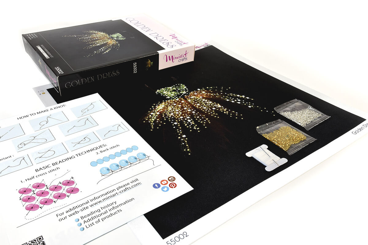Набор для вышивания бисером Золотое платье, арт. MC-55002, ТМ Miniart Crafts содержит схему, напечатанную на габардине, бисер Preciosa (Чехия), иглу и нить для вышивки.