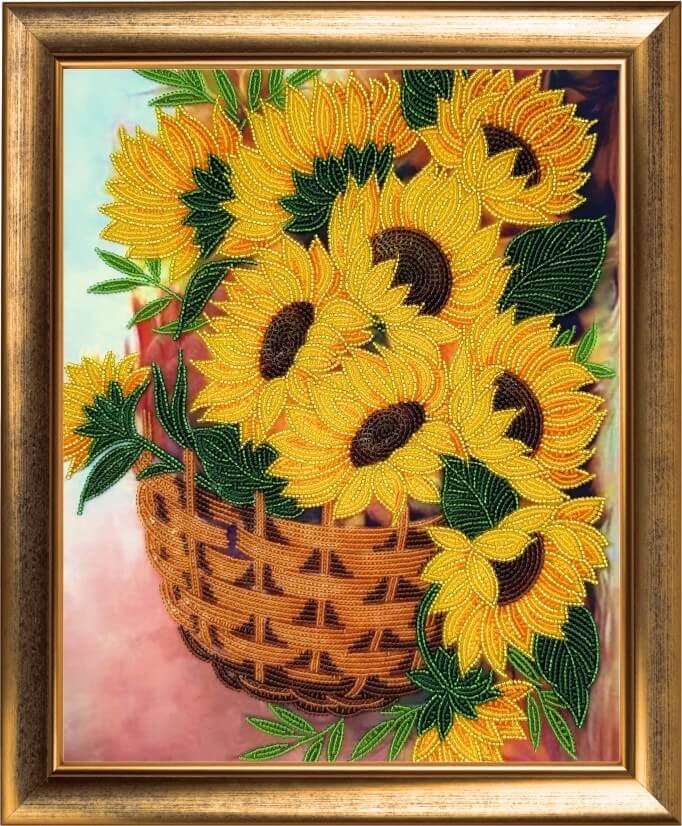 Набор для вышивки бисером с частичной зашивкой Корзинка с подсолнухами, арт. bf126, ТМ Butterfly содержит атласную схему, бисер Preciosa (Чехия, 9 цветов), инструкцию и иглу для вышивания.