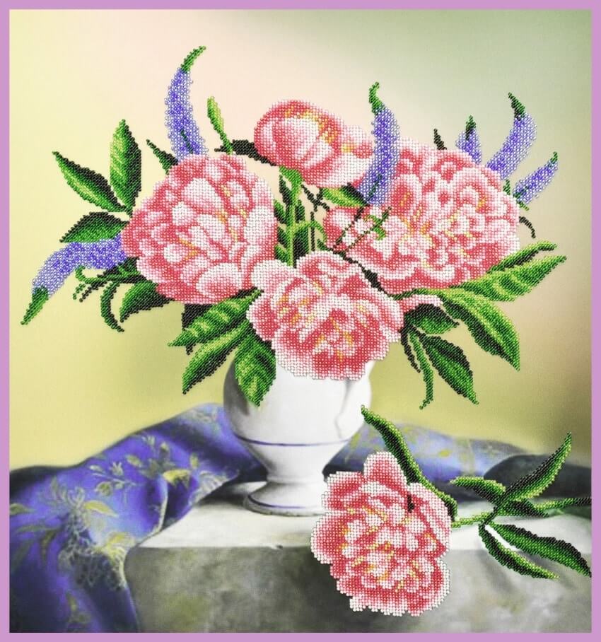 Набор для вышивки бисером Пионы на столе, Р-355 состоит из габардиновой схемы со стойкими цветами, которые не боятся стирки и не выцветают, чешского бисера Preciosa (или TOHO и бусин), иструкции и двух бисерных игл.