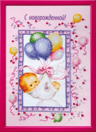 Набор для вышивания бисером С новорожденной содержит подробную инструкцию, символьную схему, чешский бисер Preciosa - 19 цветов, ткань для вышивания с нанесенным рисунком, ленту атласную двухстороннюю, бисерную иглу.