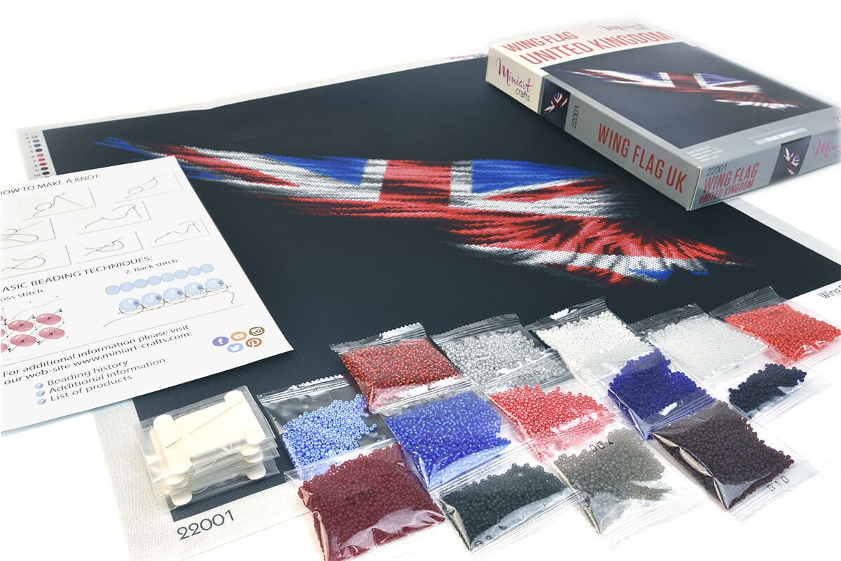 Набор для вышивания бисером Флаг Крыло Великобритания, арт. MC-22001, ТМ Miniart Crafts содержит схему, напечатанную на атласе, бисер Preciosa (Чехия), иглу и нить для вышивки.