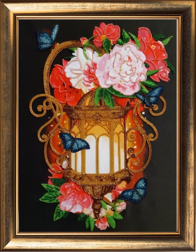 Набор для вышивки бисером с частичной зашивкой Фонарь с пионами, арт. bf129, ТМ Butterfly содержит атласную схему, бисер Preciosa (Чехия, 11 цветов), инструкцию и иглу для вышивания.