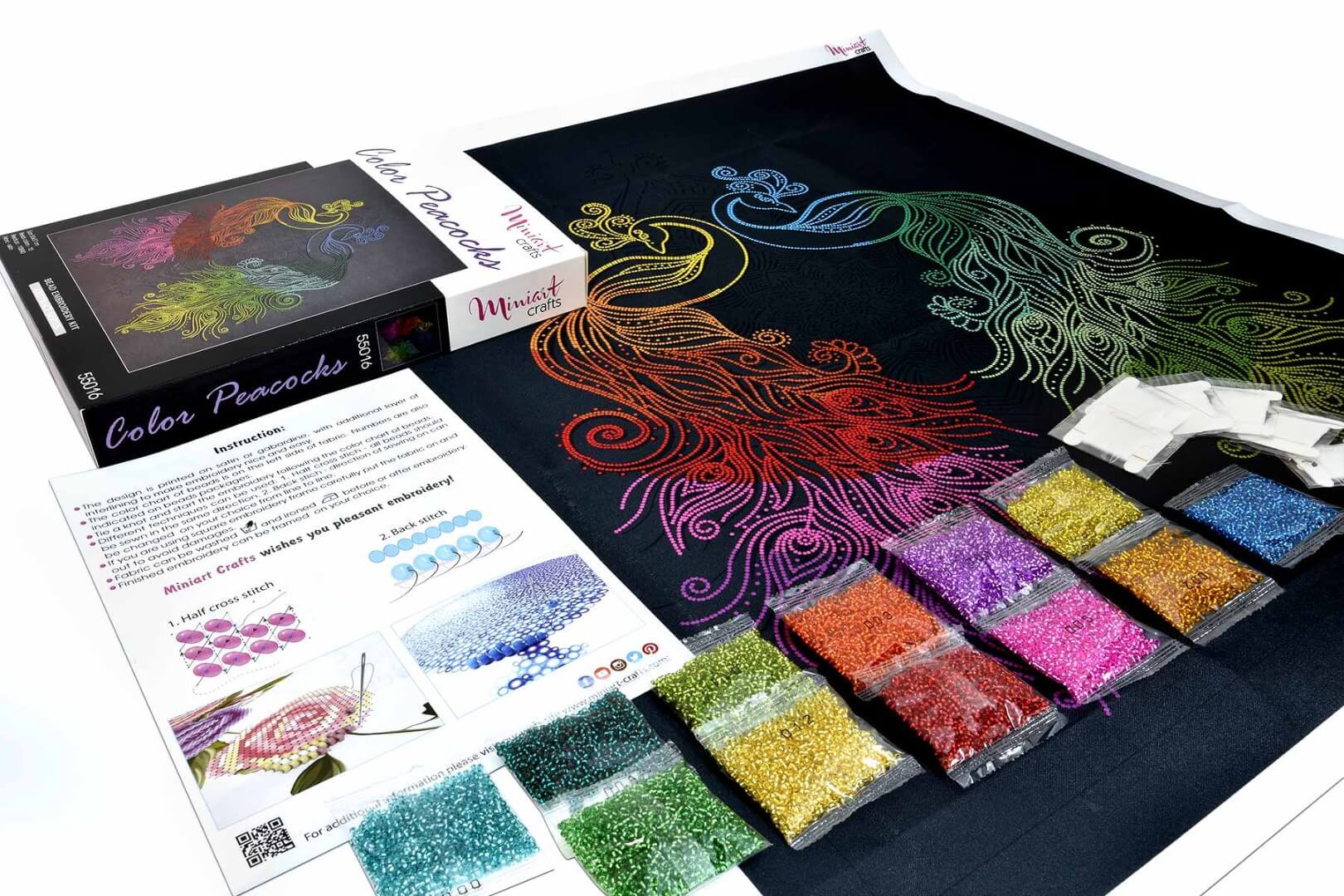 Набор для вышивания бисером Цветные павлины, арт. MC-55016, ТМ Miniart Crafts содержит схему, напечатанную на сатине, бисер Preciosa (Чехия), иглу и нить для вышивки.