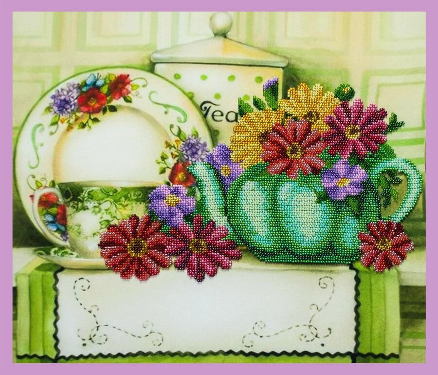 Набор для вышивки бисером Цветочный чай, Р-333 состоит из габардиновой схемы со стойкими цветами, которые не боятся стирки и не выцветают, чешского бисера Preciosa (или TOHO и бусин), иструкции и двух бисерных игл.