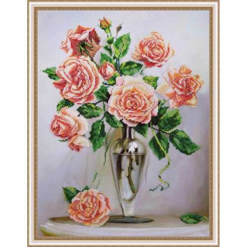 Набор для вышивки Розы на мраморном столике, P-248 состоит из габардиновой схемы со стойкими цветами, которые не боятся стирки и не выцветают, чешского бисера Preciosa (или TOHO), иструкции и двух бисерных игл.
