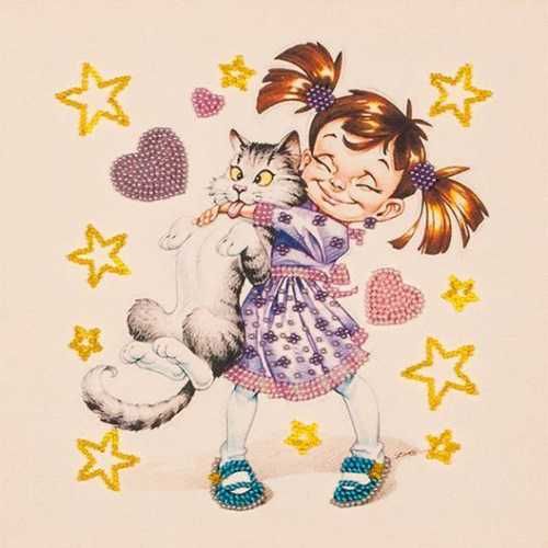 Набор для вышивания бисером на подрамнике Девочка с котом, 20*20см, Волшебная страна