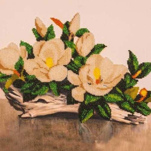 В набор для вышивания бисером Белая орхидея ТМ Волшебная страна входит схема, напечатанная на плотном хлопчатобумажном полотне, которое натянуто на подрамник, бисер Preciosa, игла с нитью, инструкция и небольшой подарок.