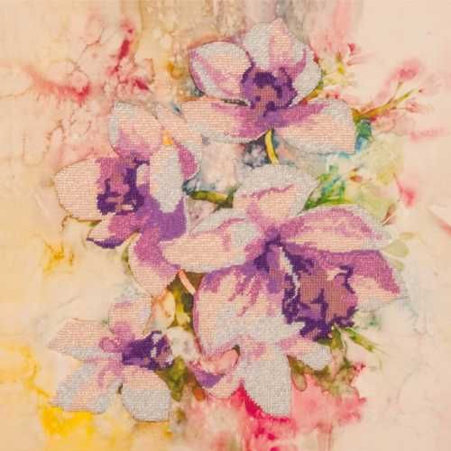 В набор для вышивания бисером Цветочная акварель ТМ Волшебная страна входит схема, напечатанная на плотном хлопчатобумажном полотне, которое натянуто на подрамник, бисер Preciosa, игла с нитью, инструкция и небольшой подарок.