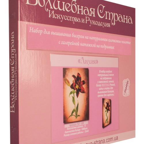 В набор для вышивания бисером Лилия ТМ Волшебная страна входит схема, напечатанная на плотном хлопчатобумажном полотне, которое натянуто на подрамник, бисер Preciosa, игла с нитью, инструкция и небольшой подарок.